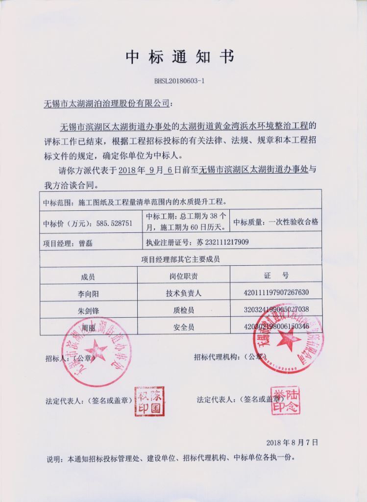 8月7日,乐动网页版_乐动(中国)在太湖街道黄金湾浜水环境整治工程投标阶段,凭借良好的市场信誉,成熟完善的投标方案,从众多竞争对手中脱颖而出,成功中标该项目,中标价585万元。